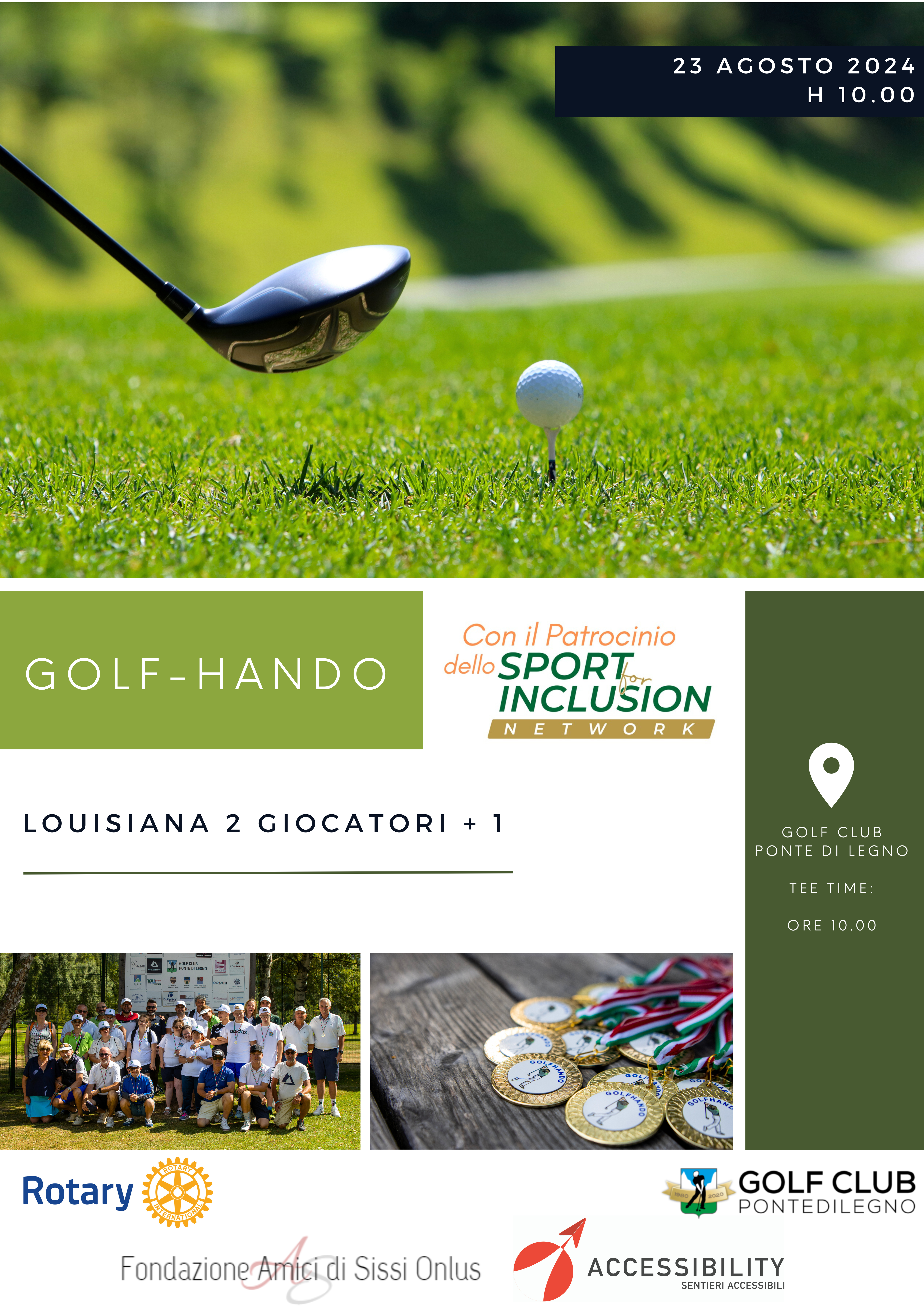 Venerdì 23 Agosto presso il Golf Club Ponte di Legno, si svolgerà la quinta edizione di GolfHando e quest’anno siamo contenti di presentare un nuovo partner per il nostro evento: Sport For Inclusion Network!