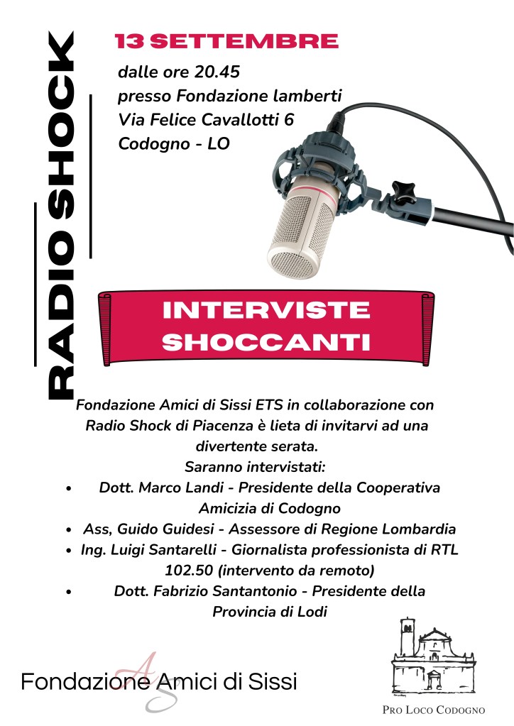 Sabato 13 Settembre presso la Fondazione Lamberti – Cooperativa Amicizia di Codogno, Fondazione Amici di Sissi ETS in collaborazione con i ragazzi di Radio Shock di Piacenza è lieta di invitarVi ad una piacevole serata.